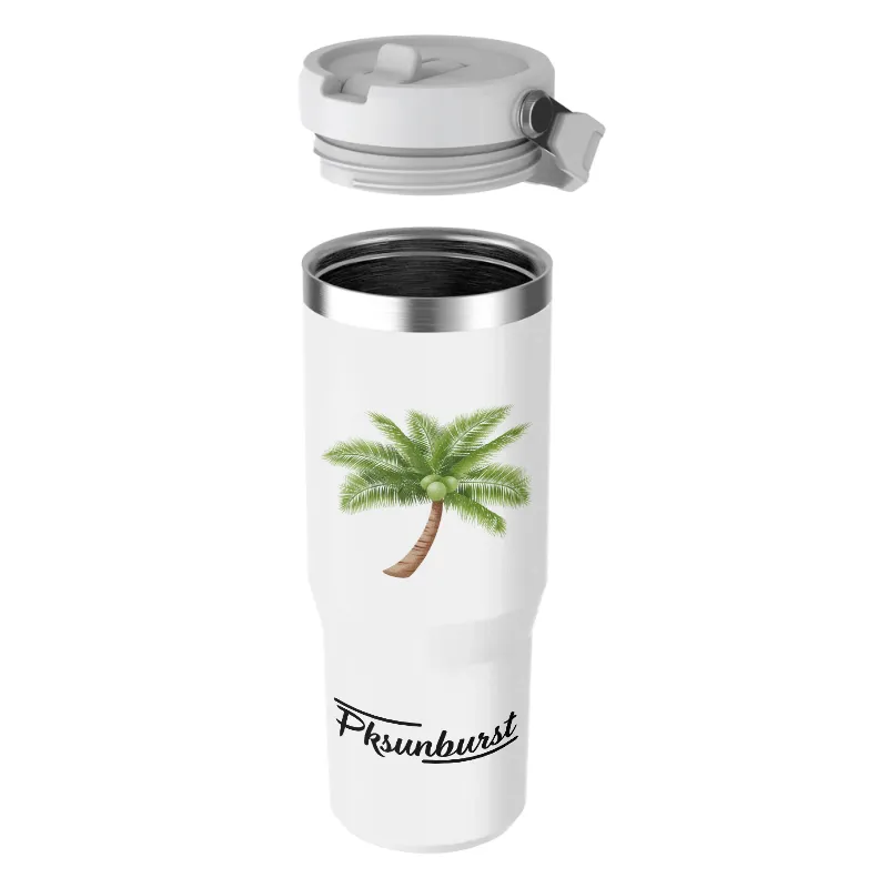 The white exterior, featuring a charming cartoon pattern, gives the tumbler a playful yet elegant look—perfect for work, travel, or leisure.